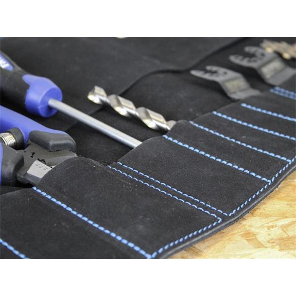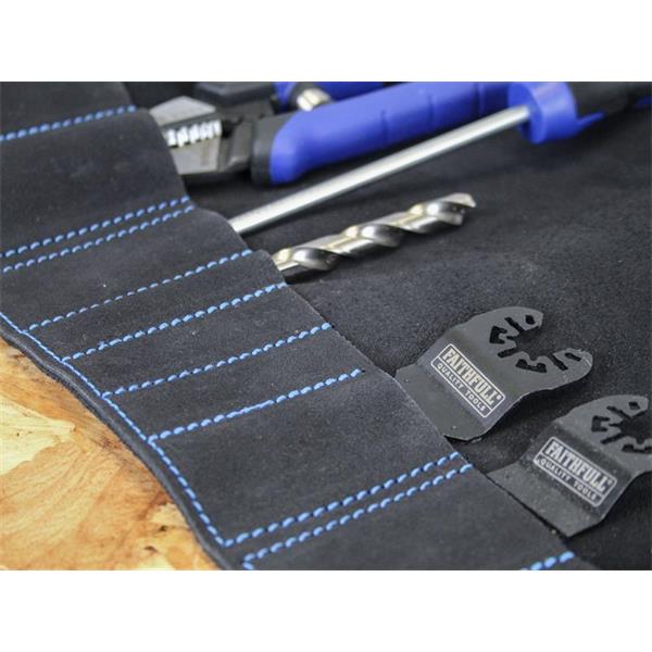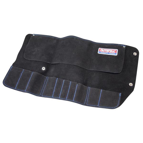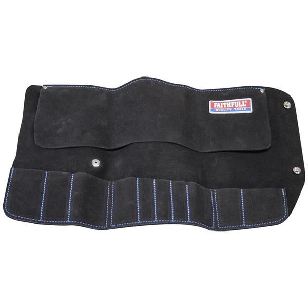 This Faithfull Tool Roll is manufactured from high quality leather. It has ten pockets of various sizes, ideal for storing small tools such as chisels, auger bits, screwdrivers, spanners and other associated items. Uses a stud fastening system for ease of use.