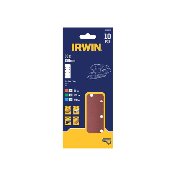 IRWIN® 1/3 Punched Sanding Sheets with Velcro attachment, reduced space between the sanding sheet and the machine allows for higher removal rate. Perforation allows for more efficent dust extraction.