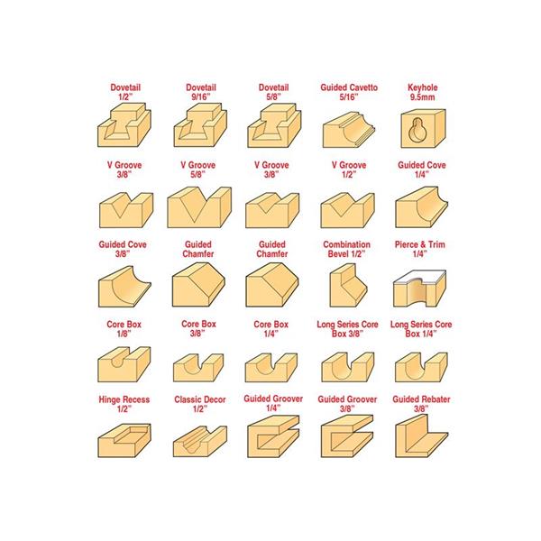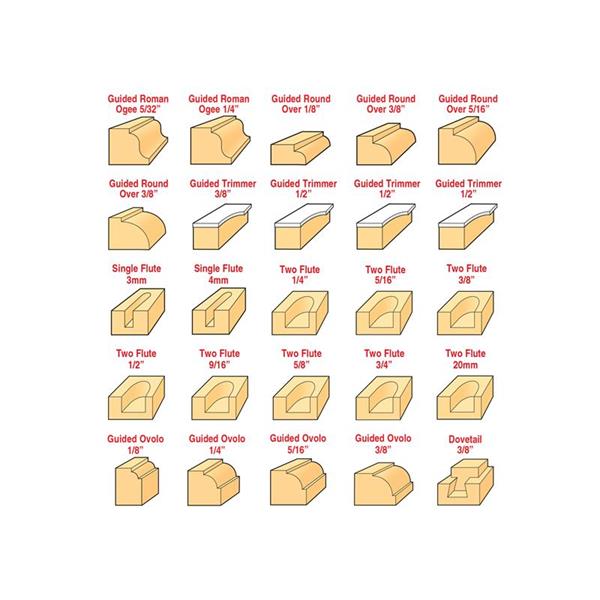 4 x Guided Flush Trim: 9.5 x 12.7mm, 9.5 x 25.4mm, 12.7 x 12.7mm and 12.7 x 25.4mm.