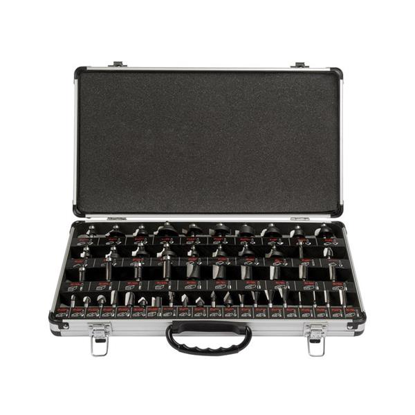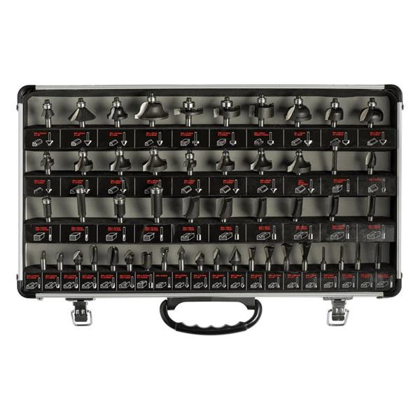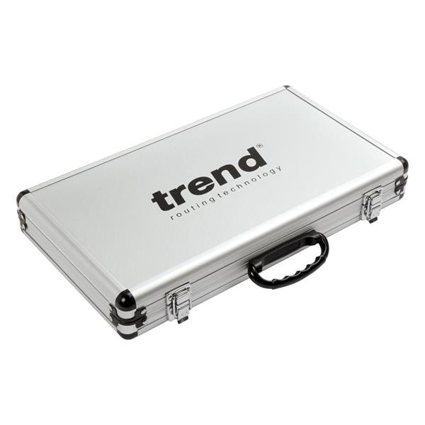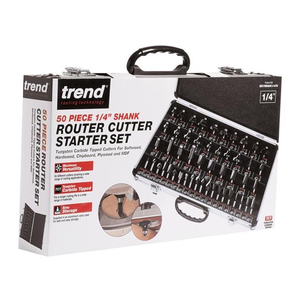 The Trend 50 Piece Router Bit Starter Set contains a range of popular 1/4in tungsten carbide tipped cutters for a variety of applications. Suitable for softwood, hardwood, chipboard, plywood and MDF. Supplied in an aluminium carry case.