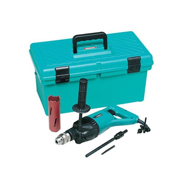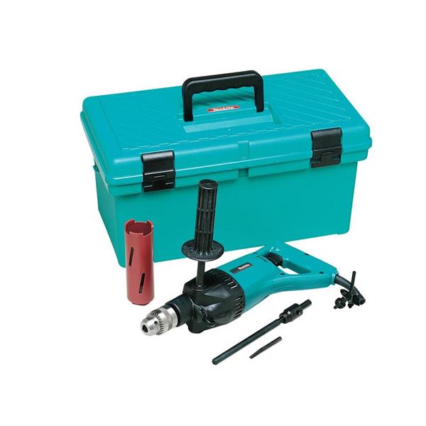 The Makita 8406X3 Diamond Core & Hammer Drill 850W 110V with a torque limiter and powerful motor. It comes with dry diamond core bits: 52, 107, 127mm and an adaptor pack.