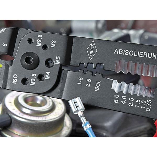 Knipex 97 22 Crimping Pliers produced for insulated cable connectors and plug connectors as well as open, non-insulated plug connectors. With threaded holes for cutting copper and brass screws threaded (M2.6 / M3 / M3.5 / M4 and M5). Manufactured from high strength special steel for optimum work results and a long tool life. Fitted with multi-component grips. Its bolted joint provides higher stability and even movement.