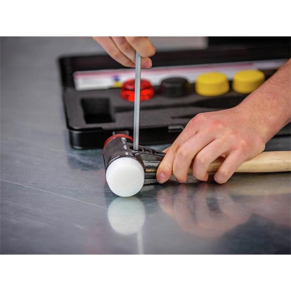 This 9 Piece Wiha Hammer Set is for all application fields, especially delicate surfaces. Contains eight interchangeable round hammer faces. These heads can be quickly and easily changed for the task at hand using the supplied hexagon L-key. GS tested.