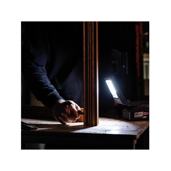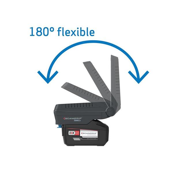 The SCANGRIP® BASIC CONNECT Compact Floodlight provides up to 1,000 lumen and can be adjusted in 2 lighting settings: 50% and 100% depending on the job. The lamp head has dual axis rotation. This means the lamp head is 180° flexible from folded position. Furthermore, the lamp head can be rotated 180° sideways providing completely flexible positioning of the light.