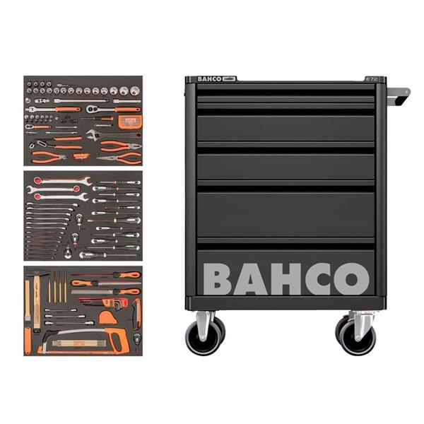 The Bahco E72 Tool Trolley has 5 fully opening drawers with ball-bearing slides that glide very smoothly and have a capacity up to 30kg. It has a sturdy steel dual-walled case construction. The dual-walled case ensures that the drawers still open after collision damage to the outer wall. A scratchproof powder coating outside and inside ensures high protection against rust.