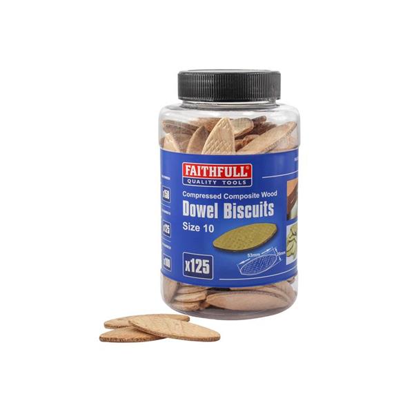 The Faithfull FAIDOWBIS10 wood biscuits come in a tub of 125, size no. 10.