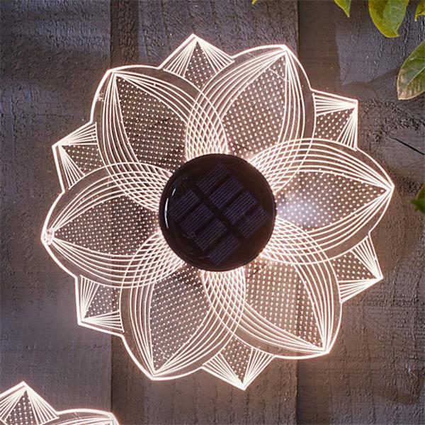Give your outdoor space a stunning wow-factor with this Solar Light Flower Wall Décor. Designed with etched acrylic petals, it creates a beautiful lighting effect that transforms walls and outdoor areas by night while acting as a decorative feature by day.