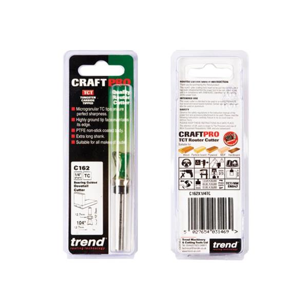The Trend C162X1/4TC Dovetail Cutter is suitable for use with Nutool and Axminster Power Tool Centre Dovetail Jigs. It has tungsten carbide tips for enhanced performance and longevity.