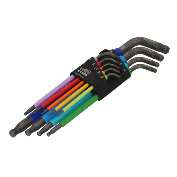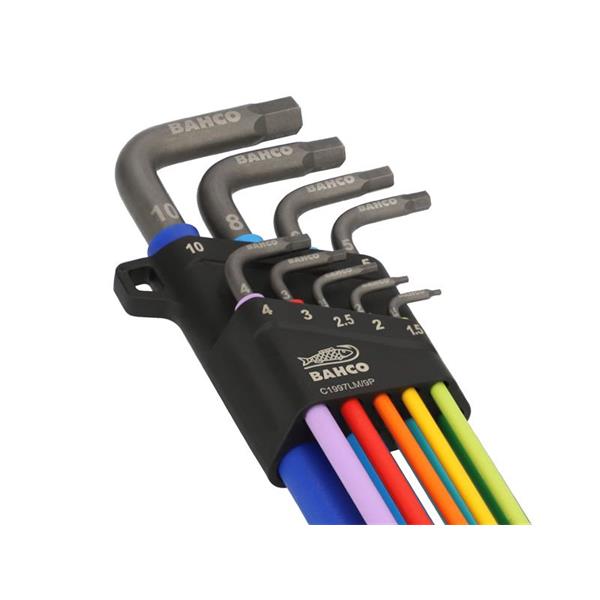 The Bahco C1997LM/9P Metric Long Ball End Coloured Hex L-Key Set, 9 piece, is ideal for driving bolts and screws which have hexagonal sockets. Long arms ensure excellent leverage, which makes driving easier.