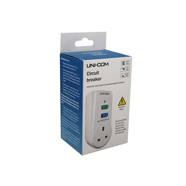 The Uni-Com Circuit Breaker will instantly cut power to prevent electric shocks. It monitors the flow of electricity and will cut the power when electricity 'leaking' to earth is detected at a harmful level. Recommended for use with power tools, electric lawnmowers, hedge trimmers etc. Helping to provide electrical safety at work, the home and in the garden.