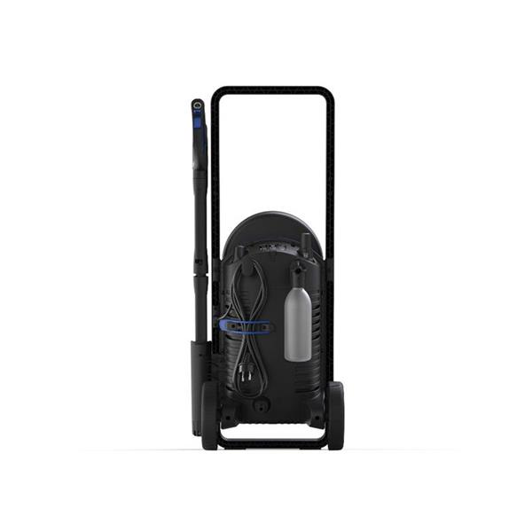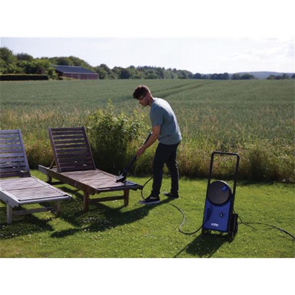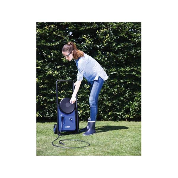 It features an internal hose reel, connecting the Ultraflex high-pressure hose directly to the pump. The hose guide is built into the machine casing, so the Ultraflex high-pressure hose is always tidily stored away before and after use. With onboard storage for the assembled gun and lance, the Gentle and Rough cleaning nozzles, and the foam sprayer with detergent bottle. To help with the choice of cleaning nozzles there is a selection guide just where you need it, printed on the machine where the nozzles are stored. Its power cable can be securely stowed away using a neat retaining storage strap on the rear of the machine.