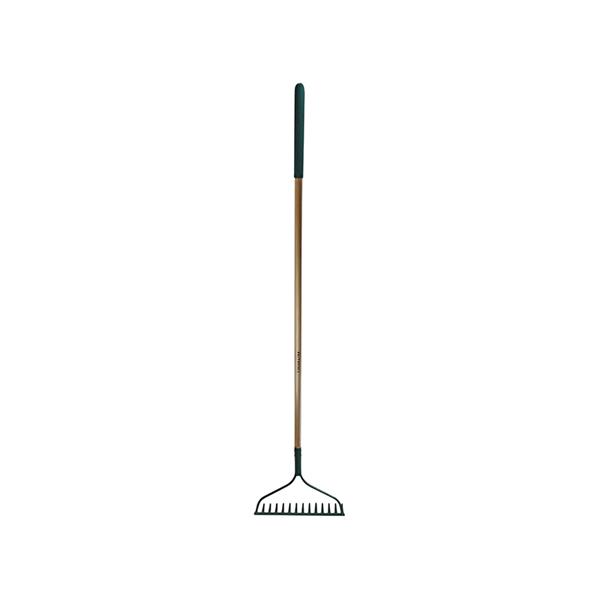 The Faithfull Countryman Garden Rake has 14 strong metal tines and strong bow head support, making this ideal for loosening soil, levelling earth and gravel, collecting weeds and disregarded undergrowth, as well as moving larger pieces of debris from the borders. The head is manufactured from heat-treated (hardened) carbon steel to provide both strength and durability. Powder-coated finish provides improved resistance to rust, scratches, humidity and alkaloids in the soil.