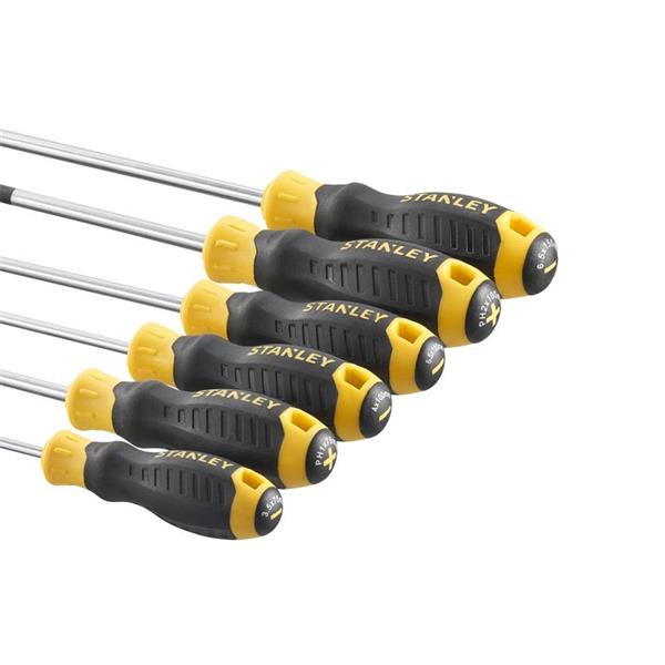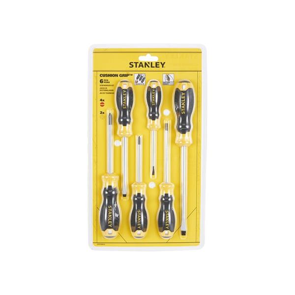 STANLEY® 6 Piece CUSHION GRIP™ Screwdriver Set. Each STANLEY® CUSHION GRIP™ Screwdriver is engineered from high-strength, chrome vanadium steel to reduce the chance of tip breakage. The strong magnetic black oxide tip is designed for improved screw retention, enhanced durability, reliability and extended product life. A chrome plated bar protects the screwdriver from rusting.