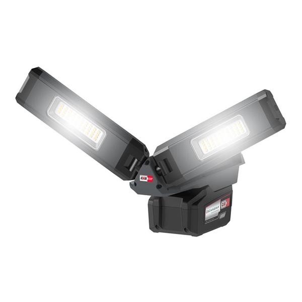 The SCANGRIP® DUO CONNECT Compact Floodlight with two lamp heads to provide illumination from any lighting angle. Both lamp heads have dual axis rotation which means the lamp heads can be rotated in all directions independent of each other providing completely flexible positioning of the light source. When folded the DUO CONNECT is very compact and streamlined. DUO CONNECT can be positioned on the surface with the battery base (NOT SUPPLIED) acting as the stand. There is also a foldable metal hook for flexible suspension.