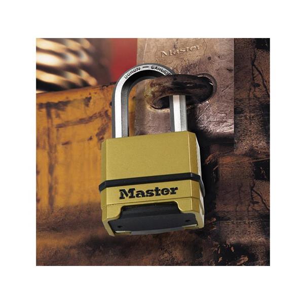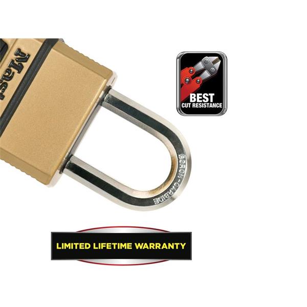 50mm Excell™ zinc body with brass finish 4-digit resettable combination padlock - 38mm Octagonal boron carbide shackle, 9mm diameter - Roller pin locking mechanism - 10,000 possible combinations