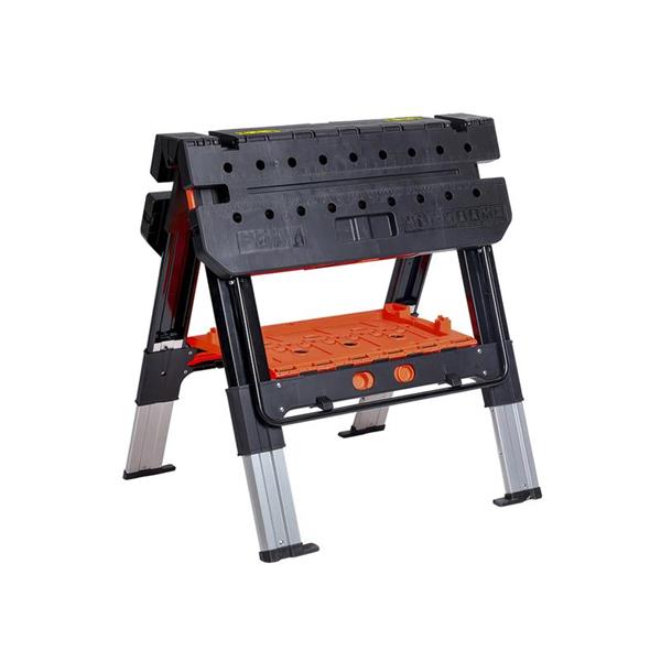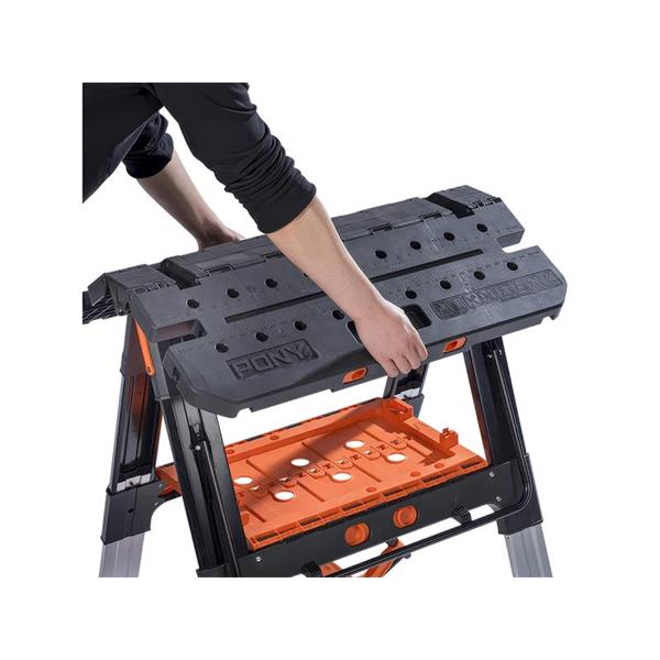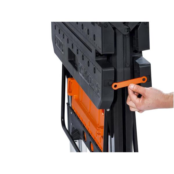 Thanks to its hassle‑free breakdown and folding mechanism, moving from job to job or from the basement to the garage is no problem. In addition, the 6 positions height‑adjusting feature allows you to adapt to any size project, enabling you to work at different levels. A built‑in shelf provides storage for tools and materials, saving space and keeping everything close by.