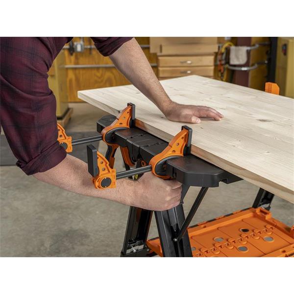 The convenient 2‑in‑1 worktable and sawhorse makes for quick and easy conversion for tackling more projects. E‑Z Hold® bar clamps can fasten directly to the worktable/sawhorse, as well as hold items vertically or horizontally for greater flexibility while you work.