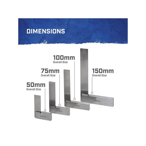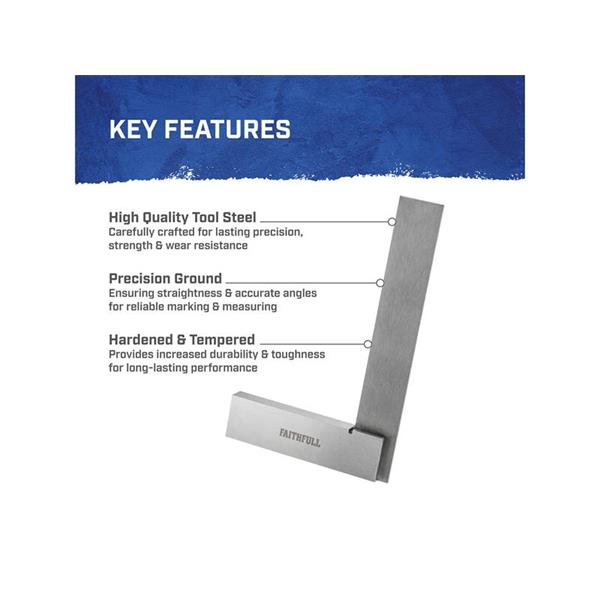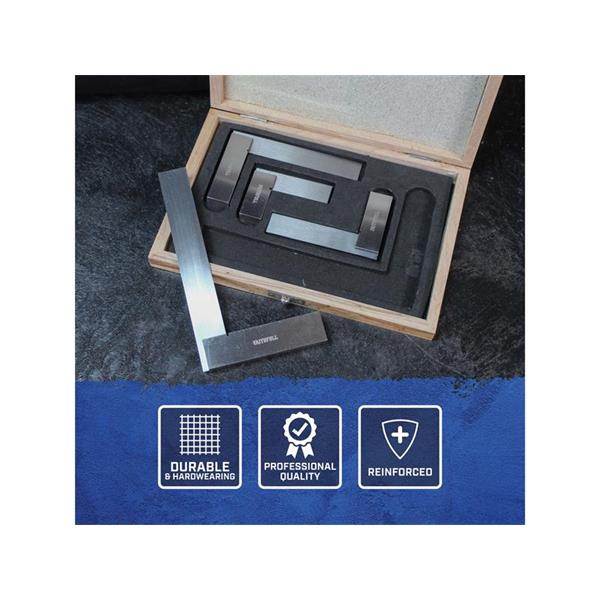 Faithfull Engineer's Squares Set supplied in a wooden storage case. Carefully crafted from high-quality tool steel. The stock and blade are precision ground to ensure straightness and accuracy, and the spring steel blade is hardened and tempered for increased durability.