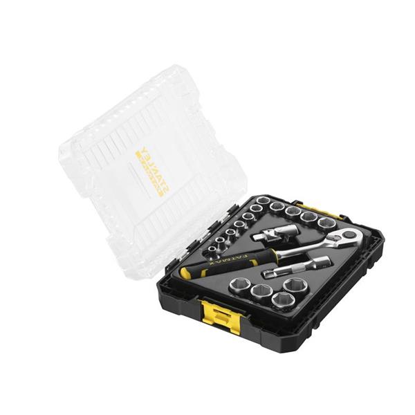 The STANLEY® FatMax® 3/8in M PRO-STACK™ 18-Piece Socket Set contains a selection of Maxidrive Sockets; with knurling to help take and use the socket easier. A neck-down design facilitates usage in restrictive environments. The Maxidrive profile maximises contact between the socket and nut, and visible dimensions to easily identify socket size.