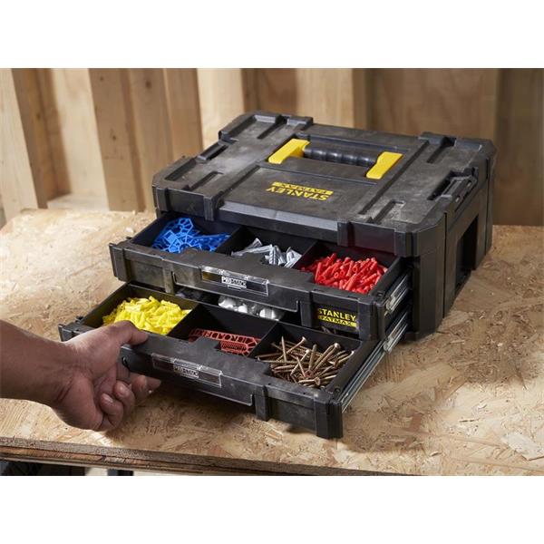 This STANLEY® FatMax® PRO-STACK™ Box has 2 shallow drawers, each drawer has dividers for customisable storage of small parts and accessories. Fitted with a carry handle for comfort and easy transportation.