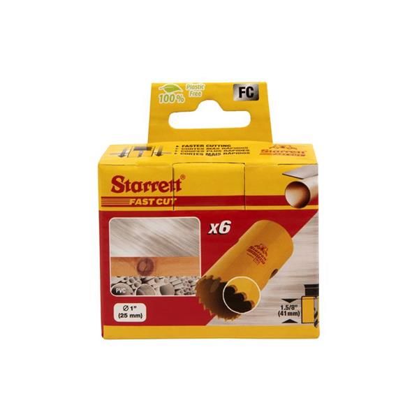Bulk pack of 6 Starrett Fast Cut Bi-Metal Holesaws.They provide a smoother, faster cut on a wide range of materials, when compared to the previous constant pitch saw. Improved tooth material and 5.5 TPI/25mm tooth form for enhanced heat and wear resistance and greater product life.
