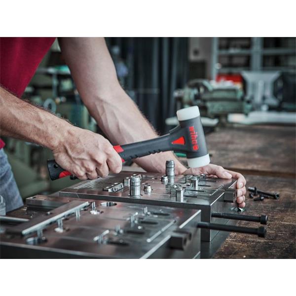 In addition, the powerful connection between the hammer head and handle ensures greatest safety while working and the shatter-proof nylon heads can be independently replaced at any time. GS standard according to DIN 5134.
