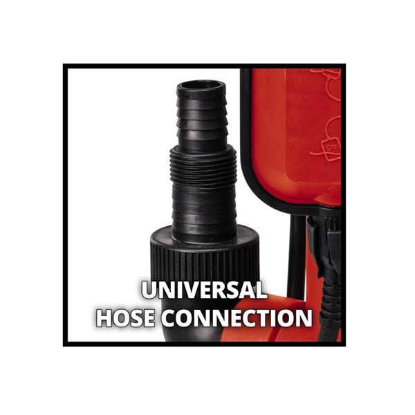 For better portability, a foldable carrying handle is attached to the impact-resistant plastic pump housing. The pump has a continuously adjustable float switch and a high-quality mechanical seal to ensure a long service life. The pump offers several connection options with a universal connection for 25/32 mm hoses and a G1 external thread (33.3 mm) as well as a 90° elbow.
