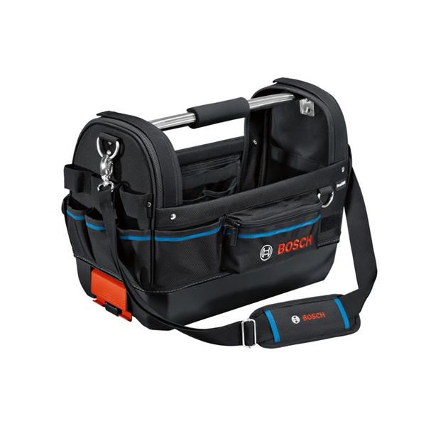 The Bosch GWT 20 Professional Tote Bag for easy storage and convenient transport. Versatile compartments and pockets allow quick access and individual organisation of tools with additional integrated tapes for attaching the ProClick Holder and pouches.