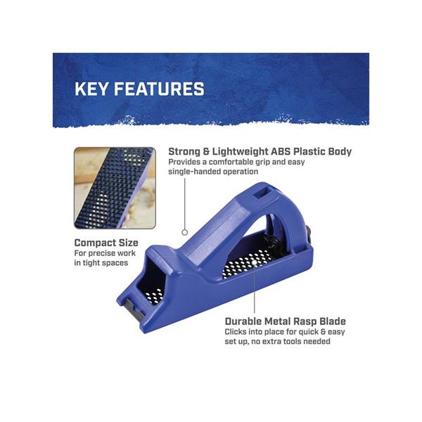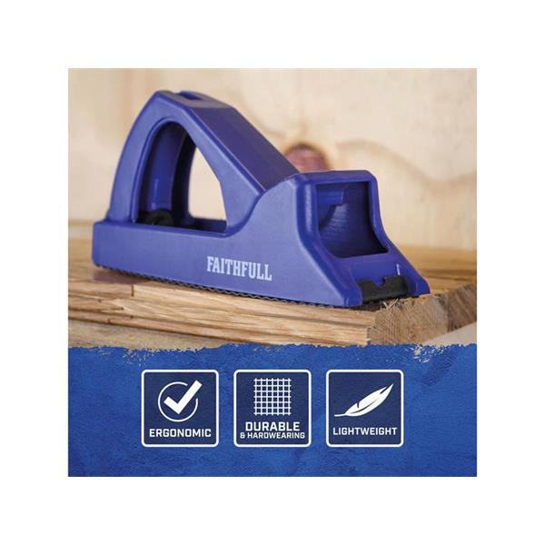 The Faithfull Hand Rasp Block Plane is suitable for removing material from all types of wood, aluminium, plastics, fibreglass and laminates. It can also be used for plaster and filler removal. The lightweight and strong ABS plastic body is shaped like a block plane for easy single handed operation. The durable metal rasp blade clicks into place, making its replacement tool-free and fast.