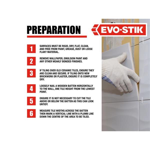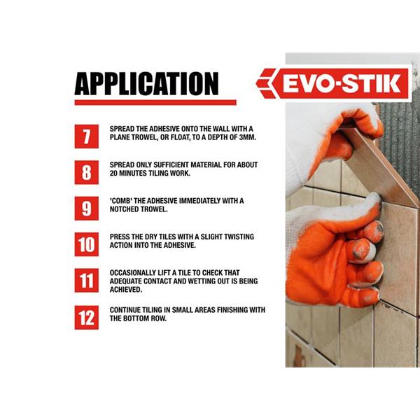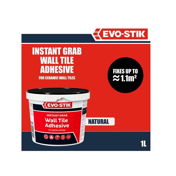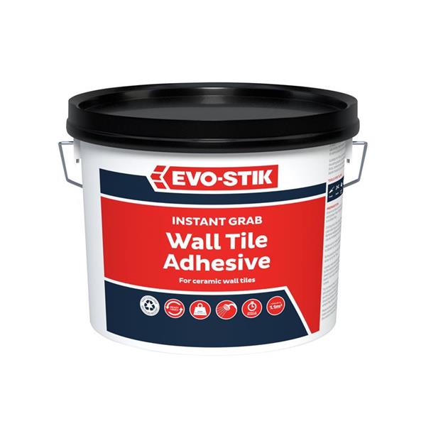 EVO-STIK Instant Grab Wall Tile Adhesive is a fast-acting, ready-mixed tile adhesive for fixing ceramic wall tiles on dry, internal walls. Its showerproof properties make it a suitable wall tile adhesive for areas subject to some splashing and condensation, such as in kitchens and bathrooms. The instant tile adhesive is easy-to-use and can be used to tile onto most substrates, including existing tiles.