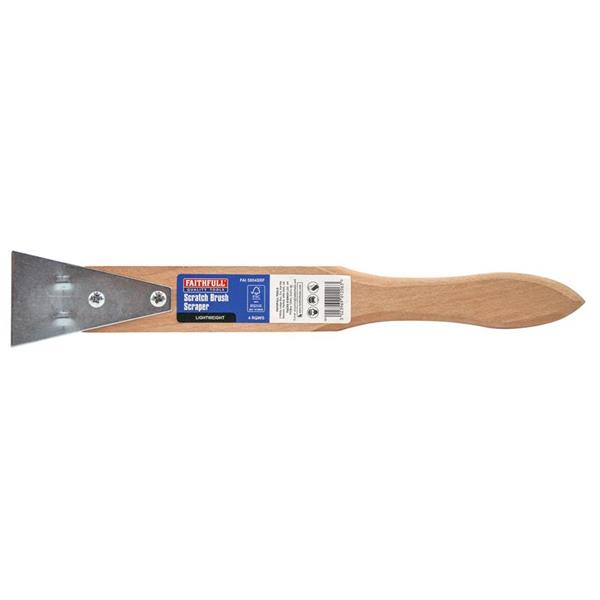 The Faithfull Lightweight Scratch Brush with Scraper. Ideal for preparatory work such as removing rust, scale, old paintwork and grouting. It features 28 gauge wire bristles hardened and tempered to provide longer-lasting abrasion. The handle is made from durable FSC beech wood and has been drilled for hanging, making it easy to store and access whenever you need it.