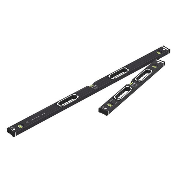 Made from extra strong, light metal. They have rectangular profile and an extra strong ribbed frame, with rubberised hand holds. Their removable end caps incorporate anti-slip wall pads, which allow the level to be held firmly against a wall with one hand without slipping. Each level has 2 vertical vials and 1 horizontal vial. The levels have 2 milled measuring surfaces, except for the 180cm levels, which do not have any milled surfaces.