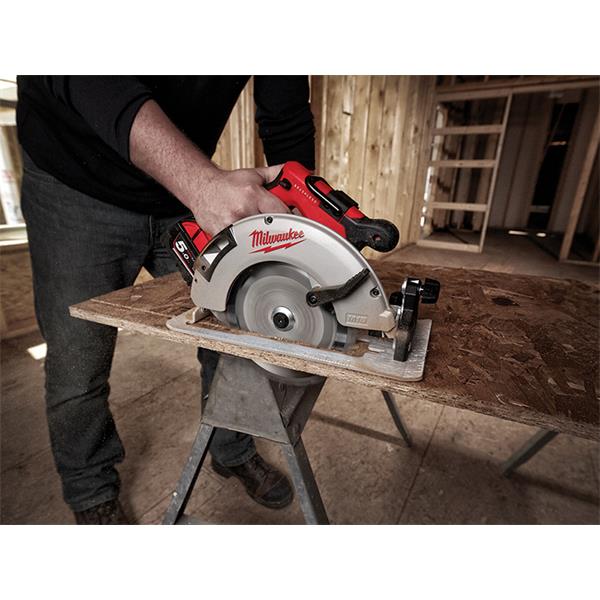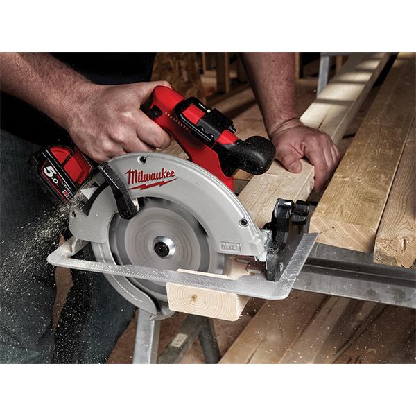The Milwaukee M18 BLCS66 Brushless Circular Saw is fitted with a pressed aluminium shoe for maximum durability. It uses a 190mm blade giving a 66mm depth of cut which enables the saw to cut 3 stacked 19mm OSB boards. An integrated LED light provides workspace illumination. Fitted with a durable metal rafter hang hook for workspace management and safety.
