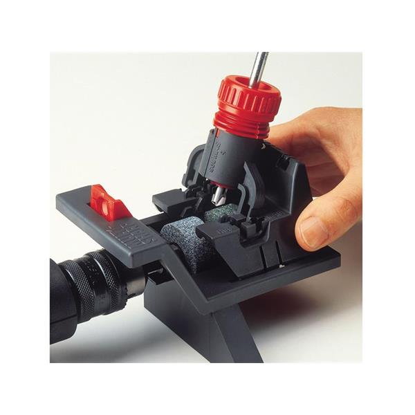 The Multi-Sharp® ATT2001 Dual Purpose Sharpener will accurately sharpen HSS and masonry bits, (including 2 and 4 edged bits and SDS Plus Bits) and Brad centre point bits. The grinding jig accurately positions each type of bit over the wheels (aluminium oxide and silicon carbide), and grinds the correct tip and relief angles. Can be powered by any electric drill.