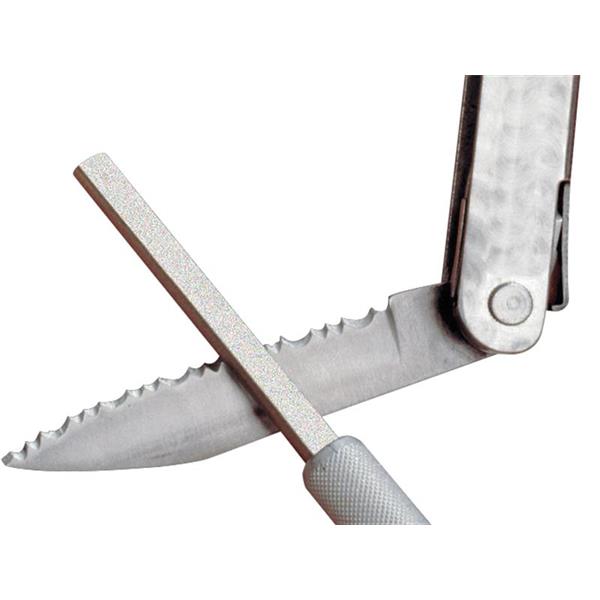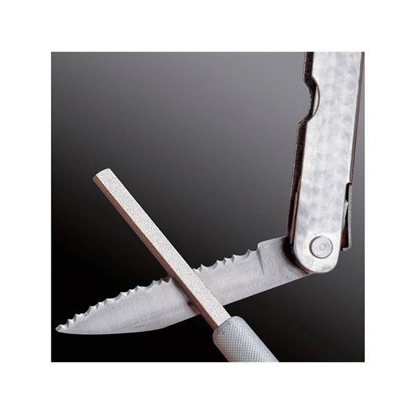 It has 3 sharpening surfaces (flat, grooved, and half-round), coated in high quality diamond particles, which provide excellent durability.