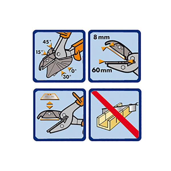 Designed for cutting plastic sections, rubber glazing joints, decorative mouldings, tile trim and PVC tape. Cutting shears for standard corners and angles. 56 mm utility knife blade.
