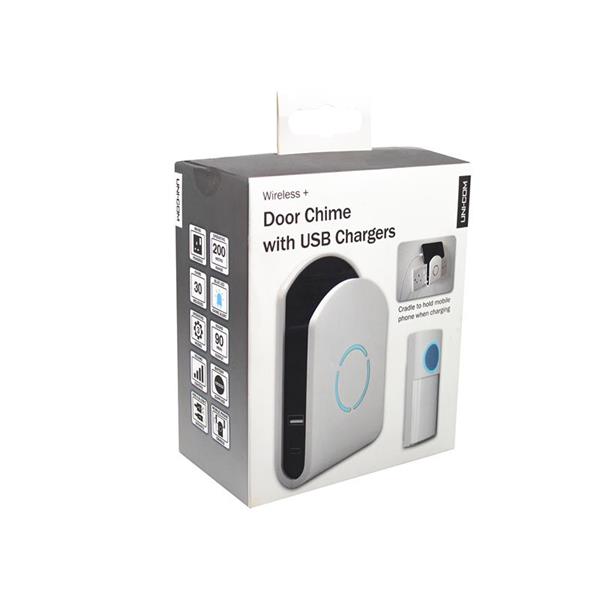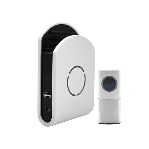 Wire-free door chime with USB charging sockets and mobile phone holder. Simply plugs into any 13A socket around your home and is wireless, so no wiring is required, and with an extensive operating range of up to 200m, you never have to miss a visitor or delivery. The USB-A and USB-C sockets enable charging of mobile phones and other devices, and the handy shelf will hold a mobile phone while charging. With 30 different chime melodies to choose from, 90dB(A) sound output with volume control and a flashing blue chime alert, you will always know when somebody is at your door. 130x85x30mm.