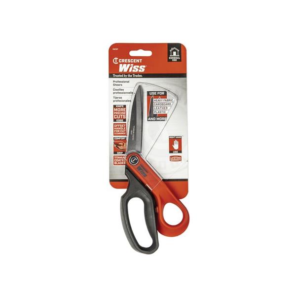 Crescent Wiss® Professional Shears feature premium steel blades with a titanium coating that is 3x harder than steel providing increased durability and longer edge life. A serrated bottom blade grips material for better control and cleaner cuts.