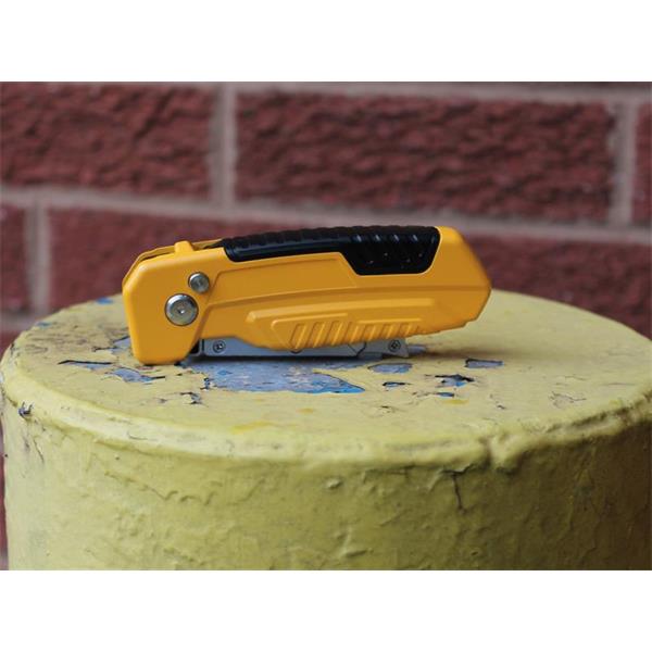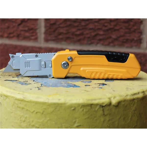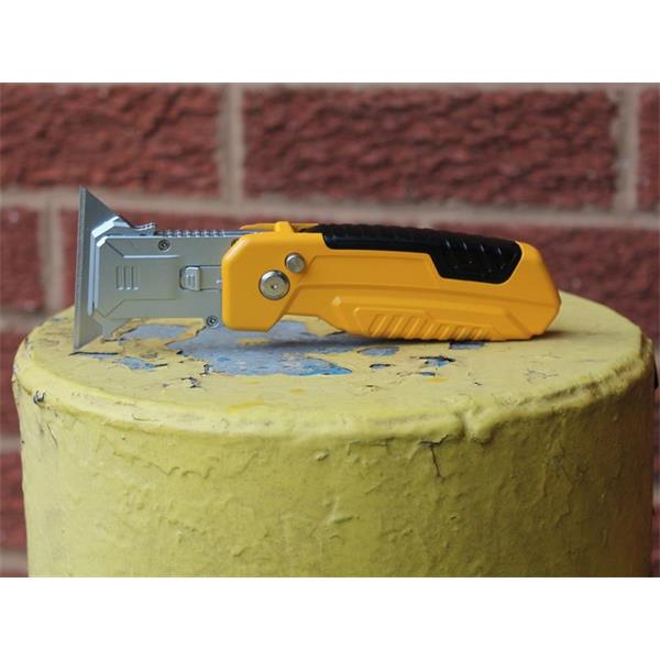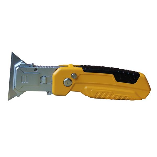 The Advent QuickSwitch Folding Knife functions as a standard utility knife and a scraper. The knife's body features a compartment to store extra blades. Other features include a safety lock button and an adjustable locking position.