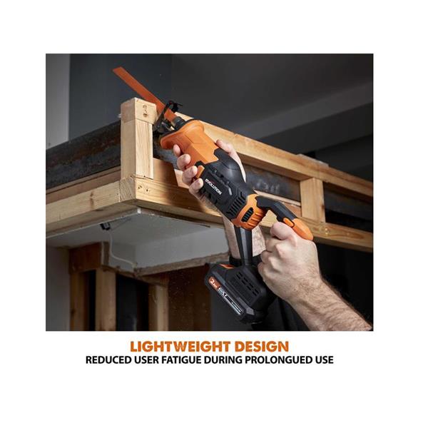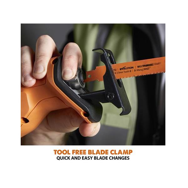 The Evolution R150RCP-Li EXT Reciprocating Saw features a variable speed trigger for intuitive speed changes and a safety lock-off switch to prevent accidental starts. A large soft-grip front handle and ergonomic soft-grip trigger handle allow for maximum control of the tool. Blade changes are made easy with the tool-free blade clamp. Simply twist the clamp collar to release the blade.