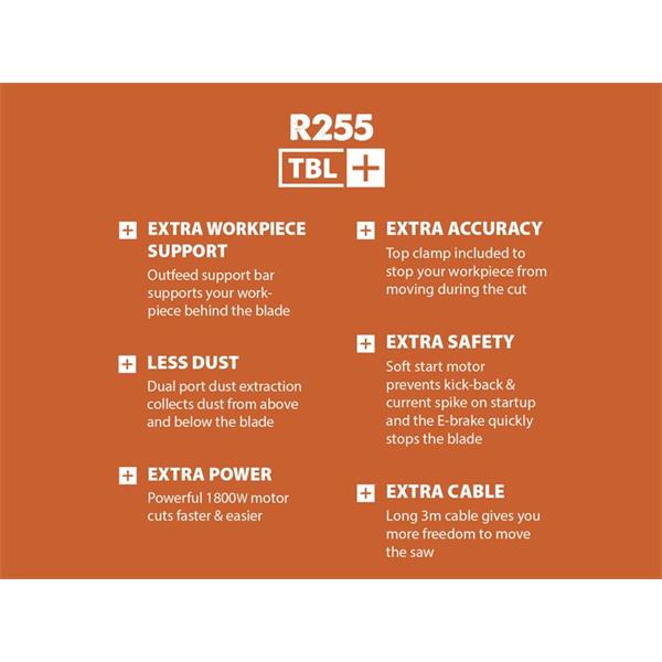 This R255TBL Table Saw is more portable. Mounted within a light, roll-cage chassis, with integral carry handles. It’s an easy one man carry without the wheeled stand, and superbly mobile on its large all-terrain wheels when you buy the matching stand, it easily passes straight through a standard width internal door (32in) making it the perfect jobsite saw.