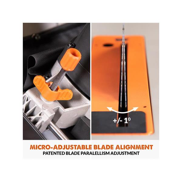 The Evolution R255TBL+ Portable Jobsite Table Saw is more accurate. It features a dual rack & pinion rip-fence for accurate, repeatable cuts. A new gear-driven blade height and bevel adjustment mechanism offers repeatable micro-adjustment. Our patented blade-to-rip-fence parallelism adjustment allows for perfectly aligned cuts in full-size sheets without binding or kickback. The R255TBL+ also features a metal throat plate with corner height adjustment.