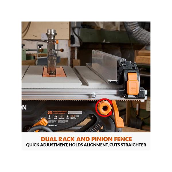 It features a dual rack & pinion rip-fence for accurate, repeatable cuts. A gear-driven blade height and angle adjustment mechanism makes repeat cuts easy and accurate. Our patented Blade-to-Rip-Fence Parallelism Adjustment allows for perfectly aligned cuts in full-size sheets with no binding or kickback. The R255TBL also features a metal throat plate with corner height adjustment as standard, there's no plastic here.