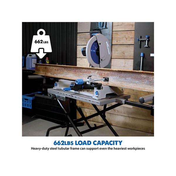 Easy to use, with multiple large grab handles and a wide wheeled base the S355MCS Stand is easy to manoeuvre, folds quickly for transportation, even with a chop saw still fitted. The 90nm Powerlift Gas Strut takes the strain when it’s time to raise it to its 870mm operating height. It's self-locking mechanism secures the platform at operating height with no user interaction.