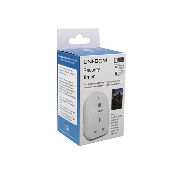 The Uni-Com Security Timer makes your home look occupied when you are out. Simply plug your lamp into the timer and switch on. Switches light on and off in a random pattern, no programming required. The built-in dusk to dawn sensor means the light will only turn on in hours of darkness.