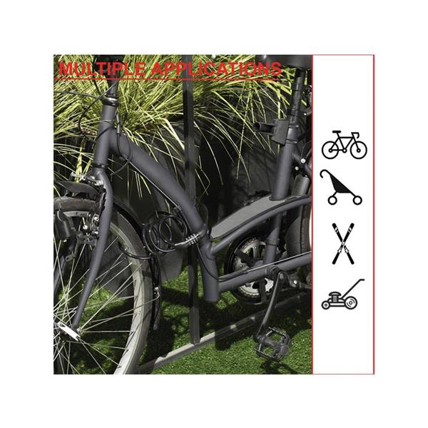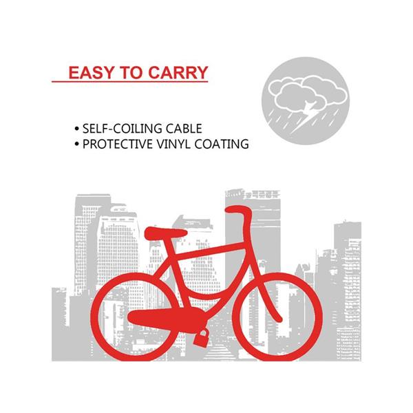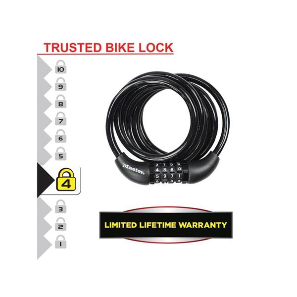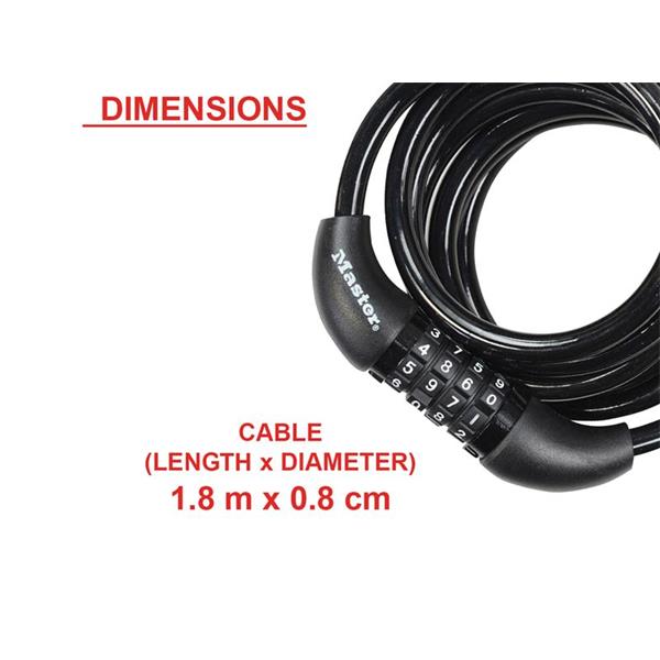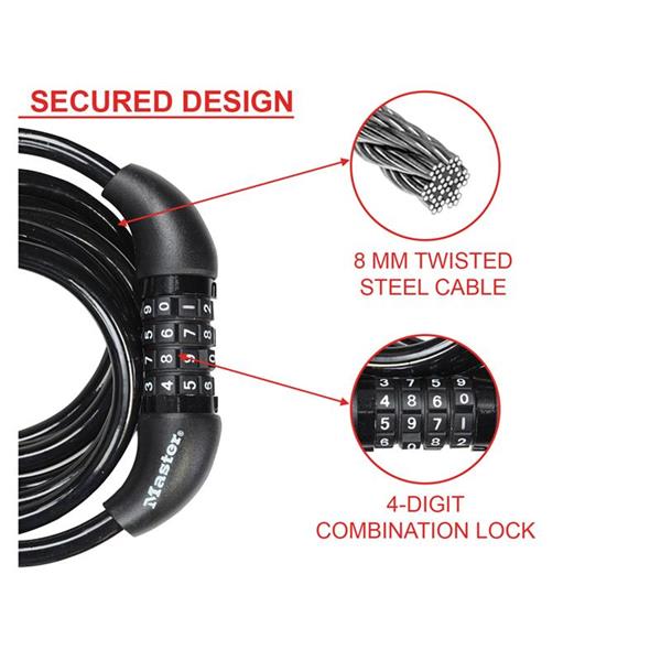 Master Lock 1.8m Self Coiling Combination Cable with a pin tumbler cylinder and a coloured vinyl covering that helps to prevent scratching.