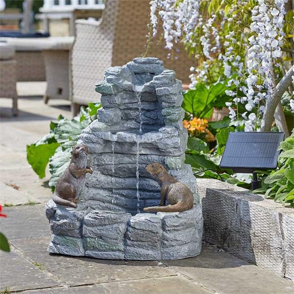 Bring your garden to life with the Otter Falls Hybrid Solar Fountain, featuring a charming playful otter design that adds character and movement to any outdoor space.