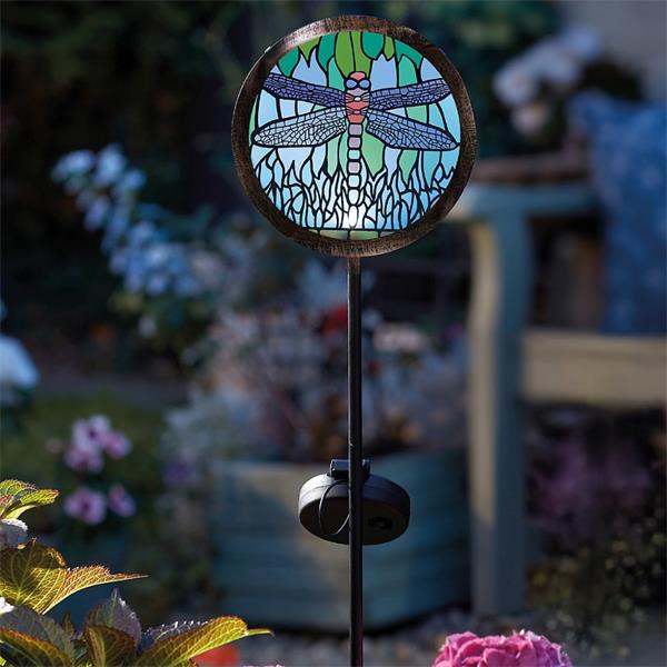Add elegance and colour to your outdoor space with this Dragonfly Solar Stake Light. Featuring a beautifully hand-painted dragonfly design, it creates a stunning stained glass lighting effect when illuminated at night.