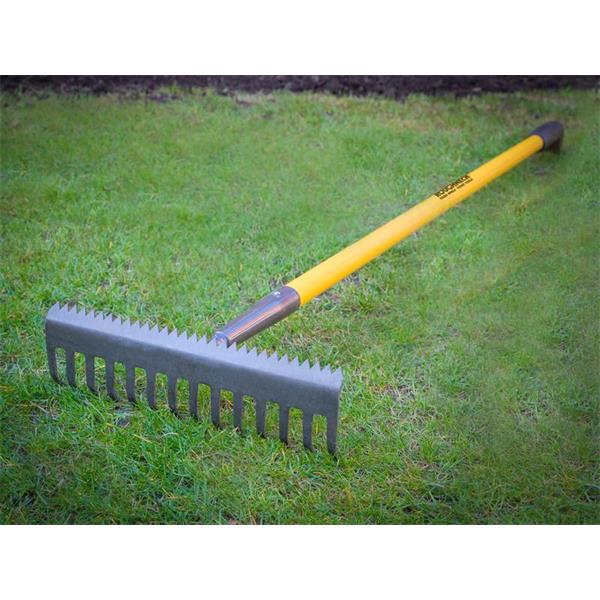 Built to last, the Roughneck® Sharp-Edge Soil Rake is manufactured from heavy-duty, carbon steel with a corrosion resistant tumble lacquer finish, connected to a tough and durable fibreglass handle that won’t perish or rot through moisture ingress. 14 recessed tines effectively penetrate, break up and spread ground materials, whilst the serrated back blade is ideal for breaking soil down into finer particles, levelling and scraping.
