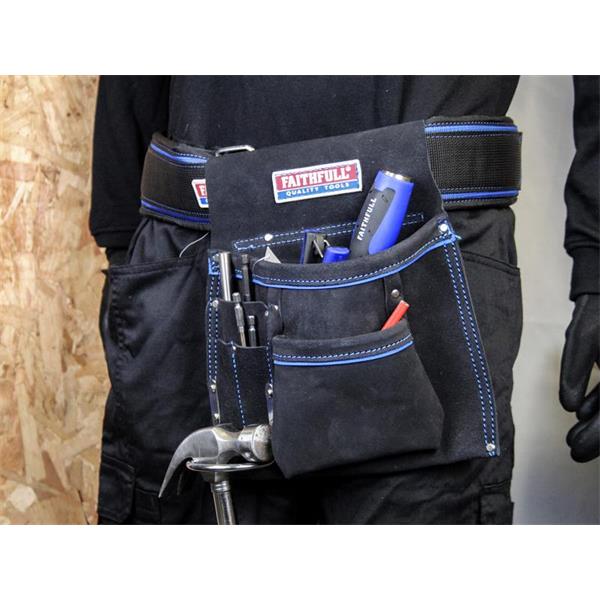 This Faithfull Single Tool & Nail Pouch is manufactured from high-quality suede. With double stitching and reinforced rivets at pressure points for added durability. It has 2 large pockets, 3 small pockets and a hammer loop, it provides ample room for nails and hand tools.